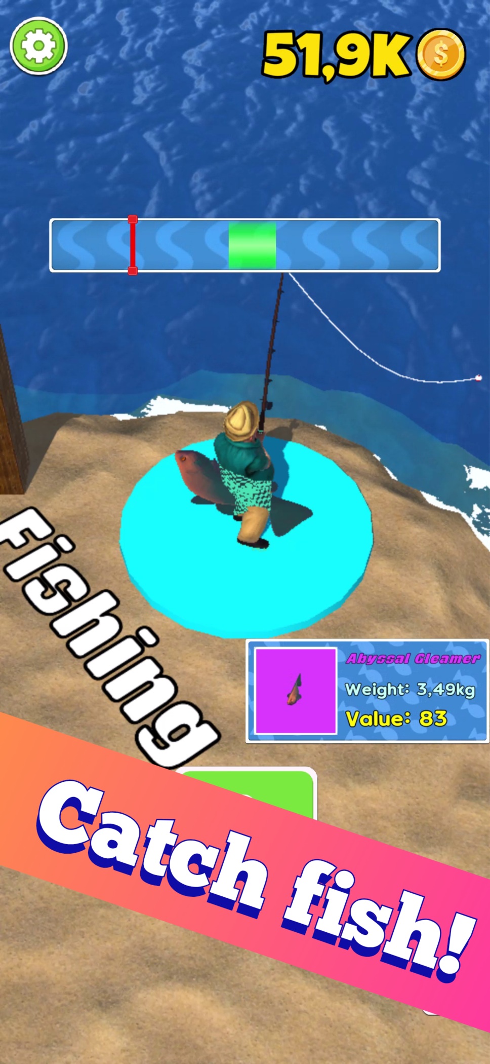 Start small with a simple rod and a boat, then upgrade your gear, unlock new fishing spots, and automate your income.